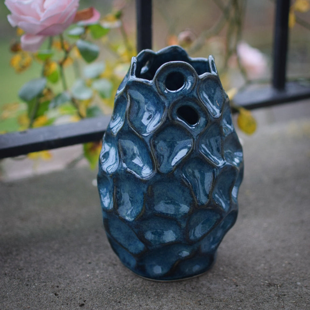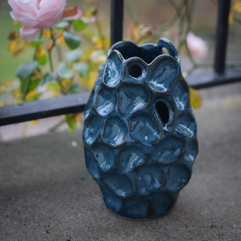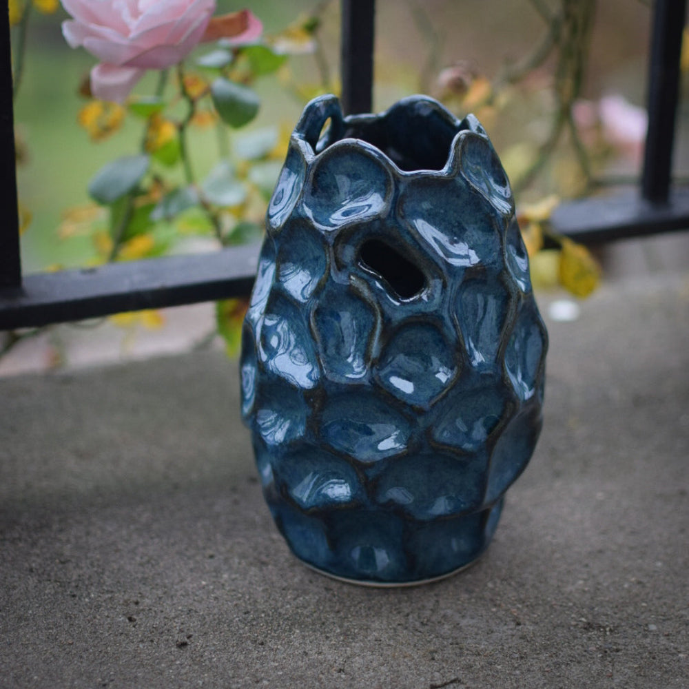 Handbyggd (ringlad) vas i stengodslera och blå glasyr med dekorativa håligheter upptill.