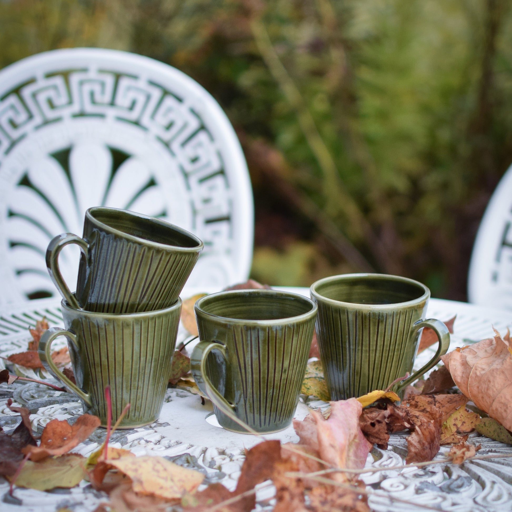 Drejad kopp med öra, i stengodslera. Finns i flera olika varianter.