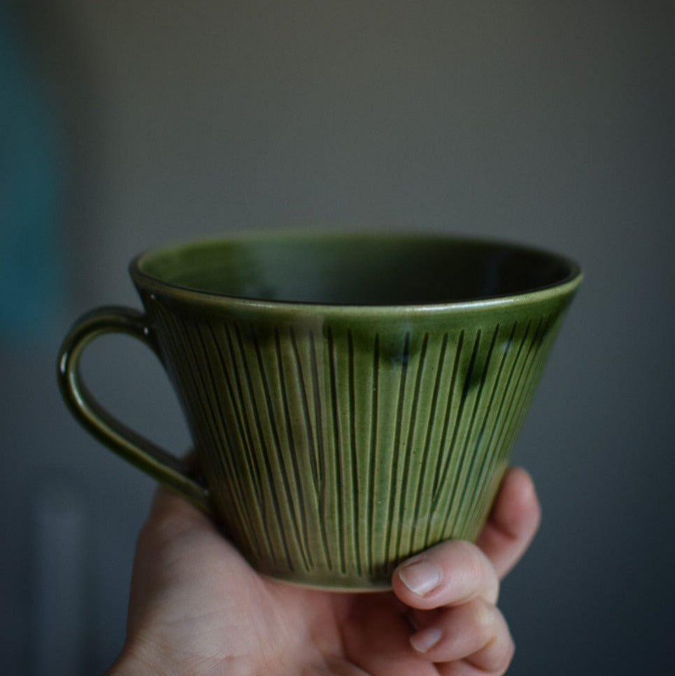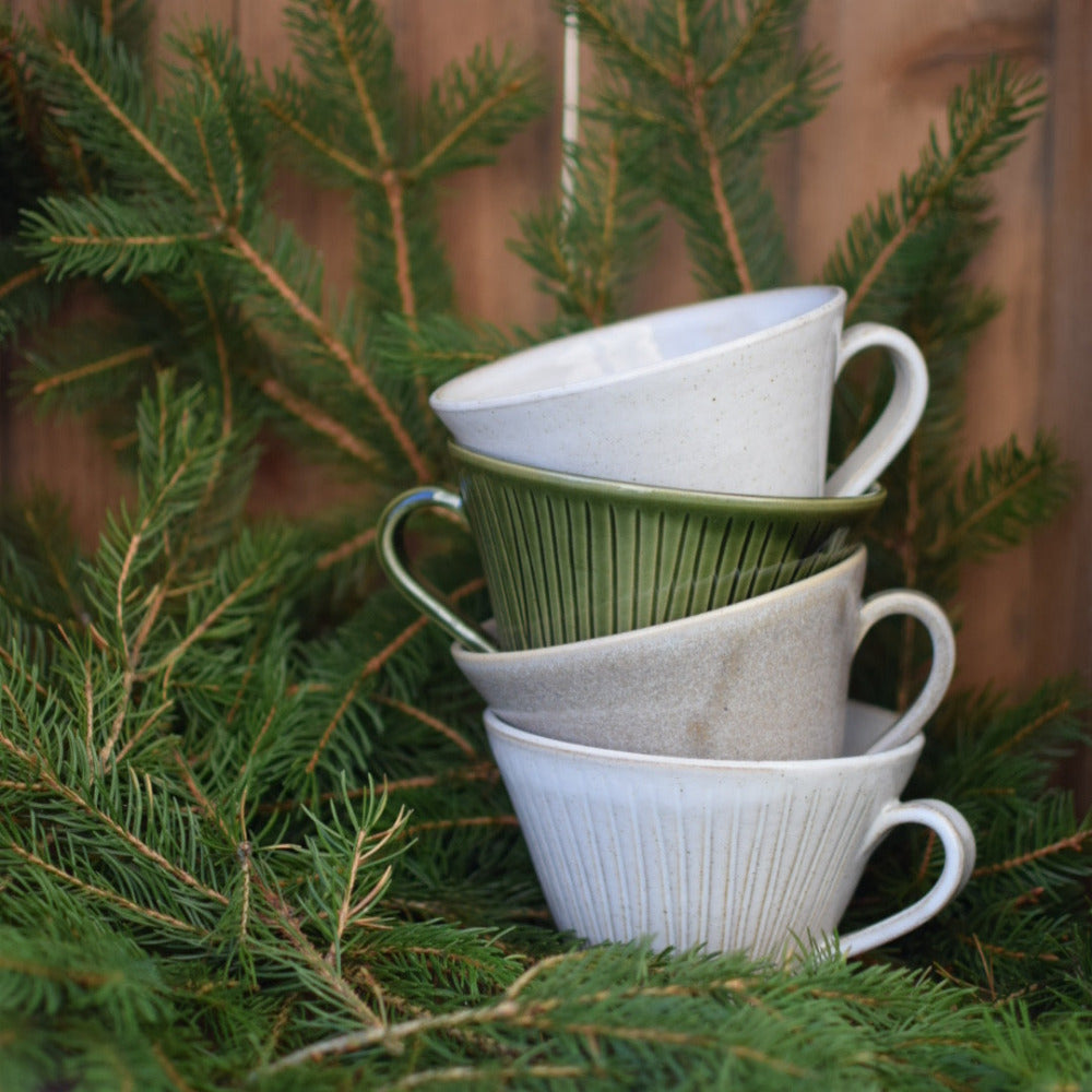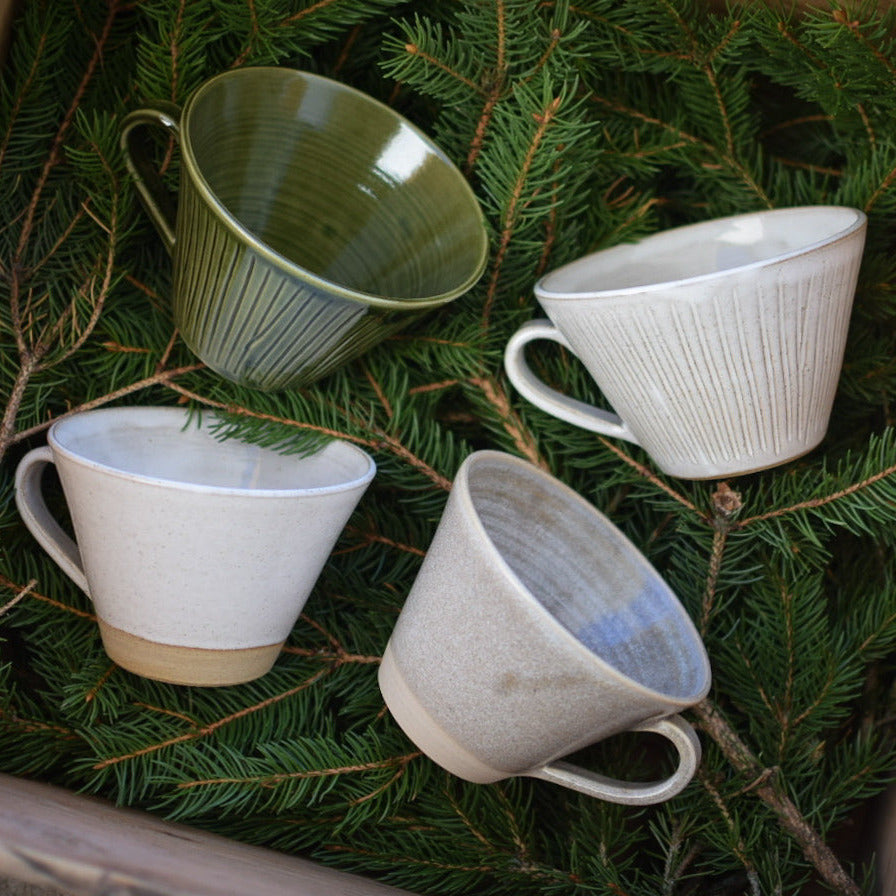 Drejad kopp med öra, i stengodslera. Finns i flera olika varianter.