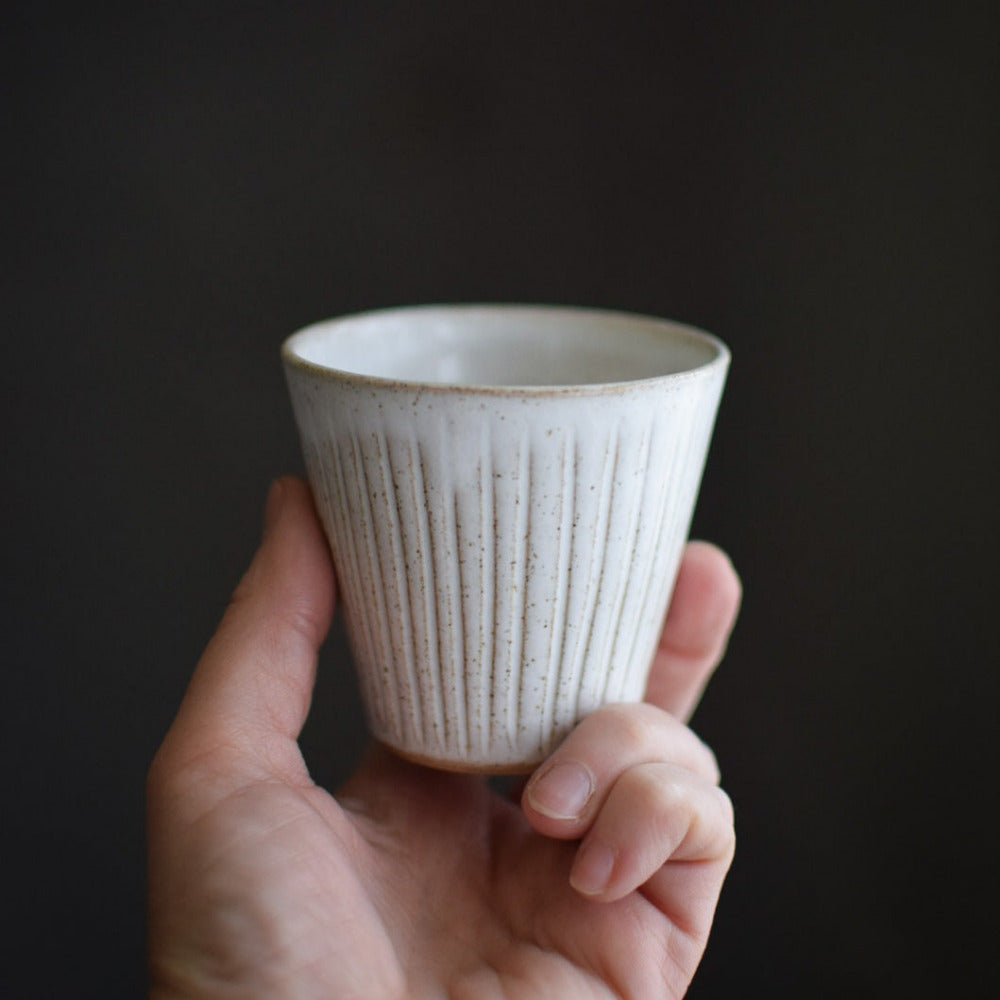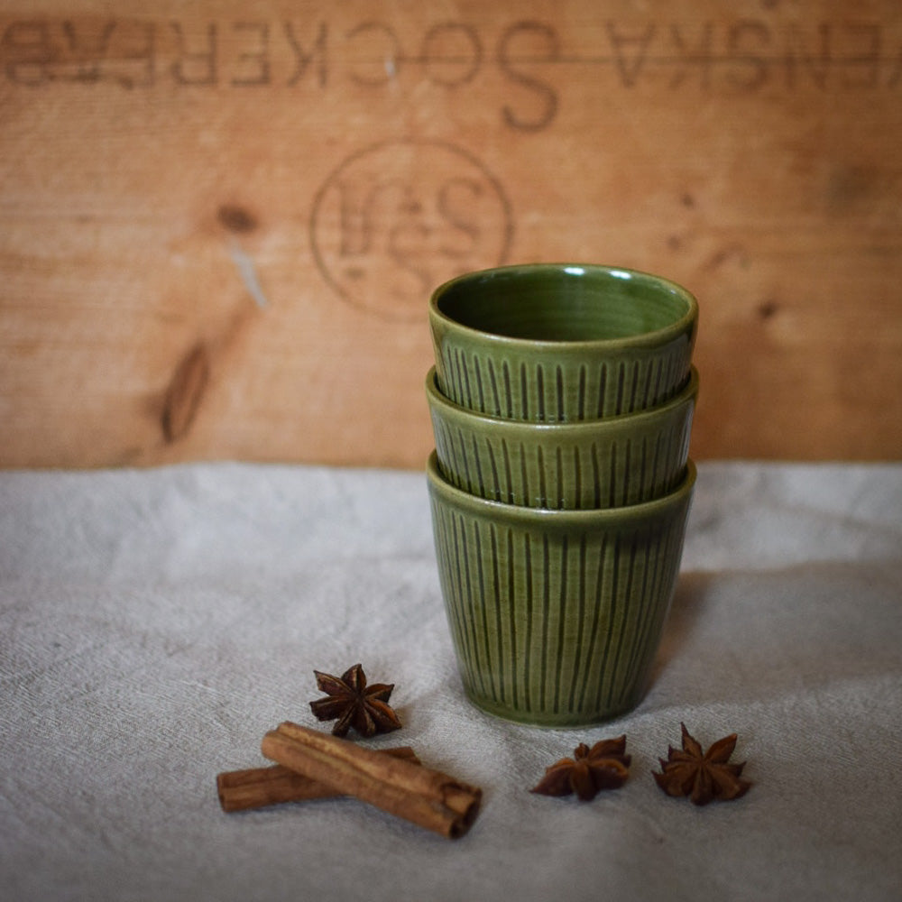 Drejad kopp utan öra, i stengodslera. Finns i flera olika varianter. Passar perfekt till exempelvis glögg.