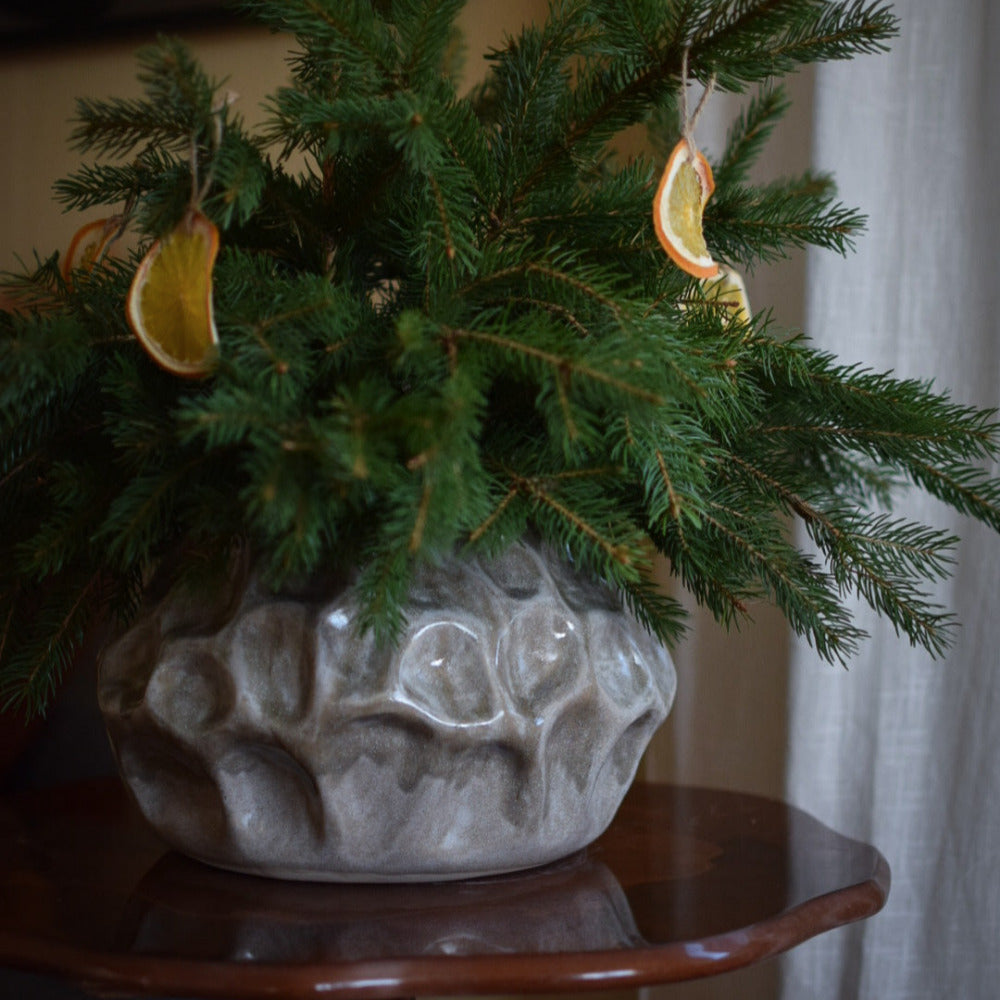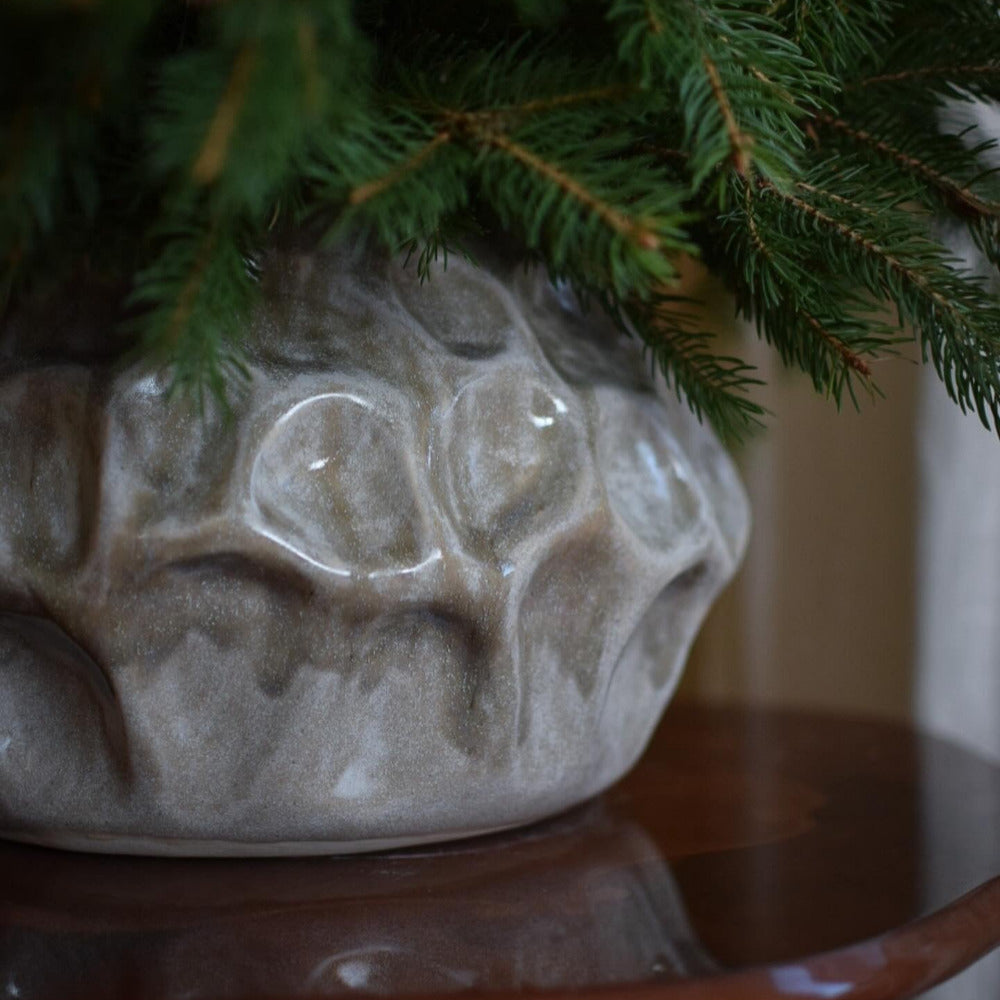 Handbyggd (ringlad) vas i gråvit stengodslera och grå glasyr.