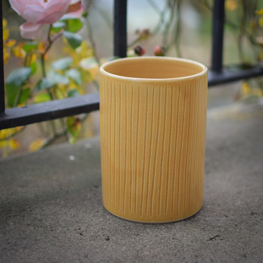 Drejad vas i gråvit stengodslera med ockragul glasyr.