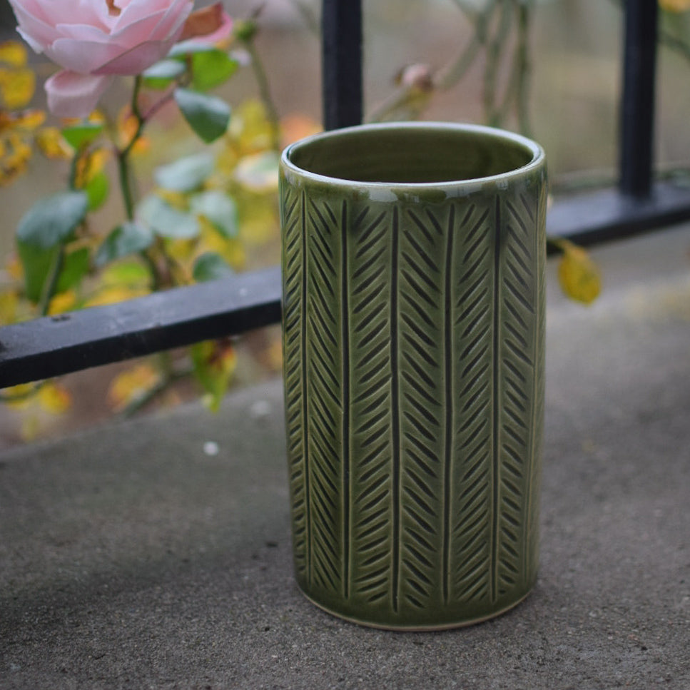 Drejad vas i gråvit stengodslera med grön glasyr.